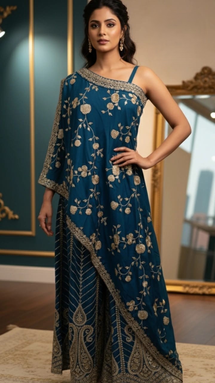 Bold. Breezy. Beautiful. This Indo-Western palazzo set pairs a one-shoulder drape with wide-leg pants, all in rich blue with golden threadwork that pops. It’s your go-to for fusion flair—whether you're styling it for a mehndi, brunch, or a glam night out. Comfort meets couture in every step.
